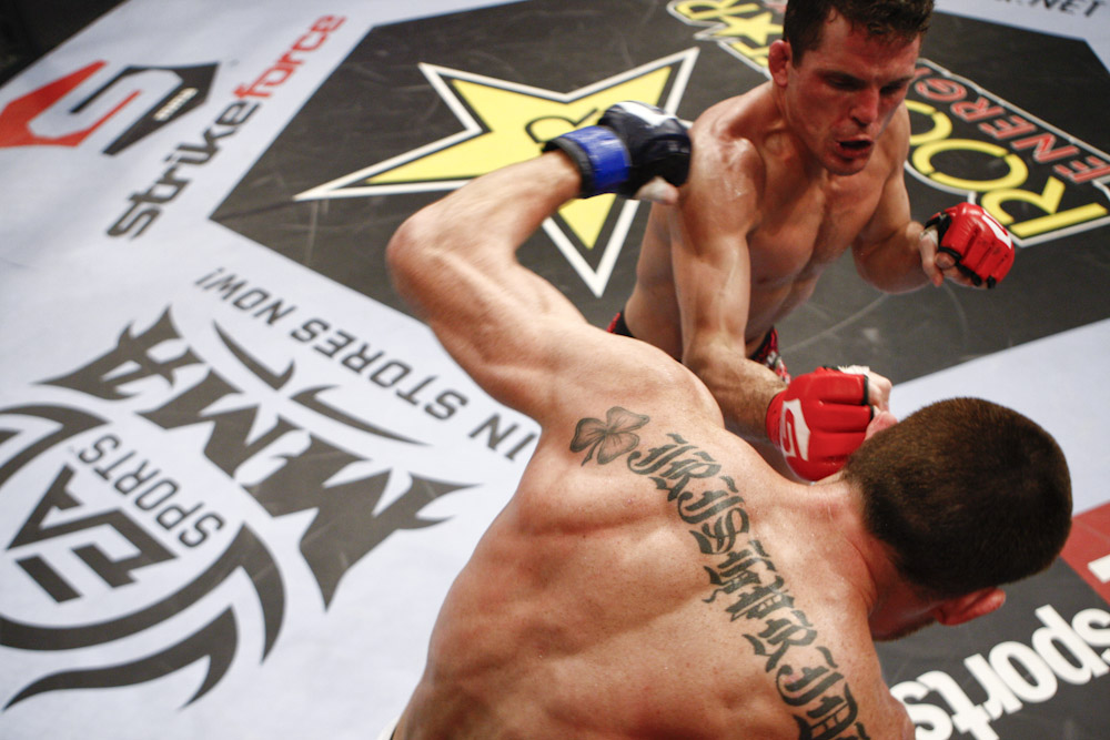 Pat Healy became the first man to defeat lightweight Lyle Beerbohm last night at Strikeforce’s latest Challengers card in Cedar Park, Texas, by working his way to a unanimous decision victory. The thrilling bout included highlight reel submission attempts and back-and-forth action, but in the end, Healy was awarded two of the three rounds by each ringside judge. With the win, Healy’s record improves to 26-17 while Beerbohm’s drops to 15-1. (Pictured: Beerbohm hitting Healy with a right)