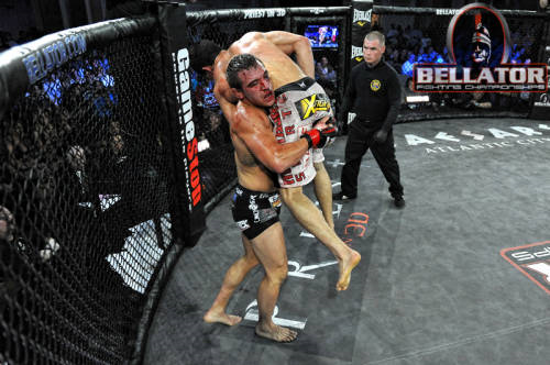 Bellator Lightweight Champion Eddie Alvarez sat cageside last night in Atlantic City, as Michael Chandler outscored Patricky Freire to entrench a future title fight with the highly regarded vet. (Pictured: Chandler carrying Freire)