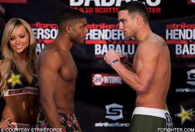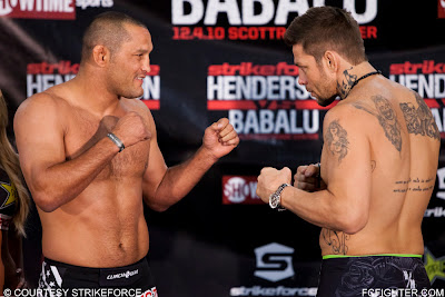 Here are the official weigh-in results for Strikeforce’s “Henderson vs. Babalu” card tonight in St. Louis, which will see Dan Henderson face former light-heavyweight champion Renato “Babalu” Sobral in the main event. (Pictured: Henderson (left) and Sobral face off)