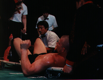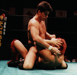 | John Lober and Ryushi Yanagisawa leg lock each other. | Lober carried out after injuring his leg. | Winner & loser trade slaps after match. |