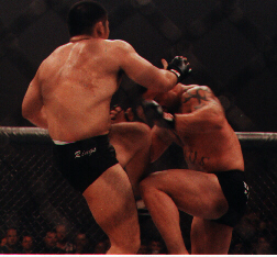 | Kimo vs Kohsaka. | Kimo takes a knee from Kohsaka. | The end! | Kimo leaves the Octagon. |