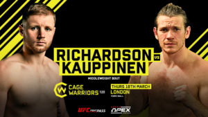 The first event of Cage Warriors’ next ‘THE TRILOGY’ series has its headline attraction – a middleweight fight between Jamie Richardson and Kent Kauppinen.