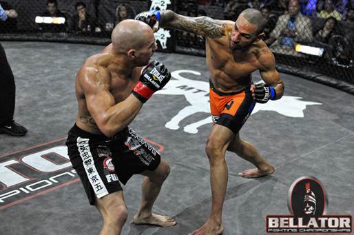 Jay Hieron may have face more established MMA competitors before fighting Rick Hawn last night in Newkirk, Oklahoma, but the former Judo Olympian gave the welterweight veteran all he could handle in the finals of Bellator’s welterweight tournament. (Pictured: Hieron hitting Hawn with a right)