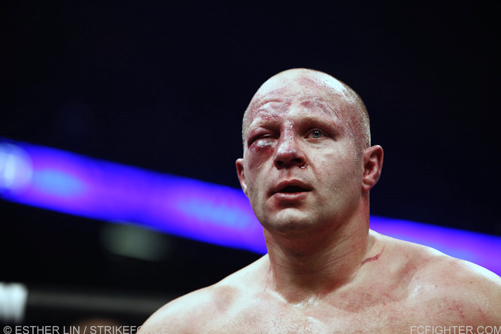 Here are the results from Strikeforce’s “Fedor vs. Silva” card tonight in East Rutherford, New Jersey, which saw Antonio Silva punish Fedor Emelianenko with ground-and-pound strikes throughout the second round, en route to a stoppage win. While Emelianenko battled his way through a brutal series of punches and a side choke attempt from Silva in the second frame, the legendary fighter’s right eye was completely swollen shut as the round ended. Moments later, the ringside physician determined that Fedor could not continue, handing the former Pride champ his second, consecutive loss. (Pictured: Silva (right) is declared the winner)