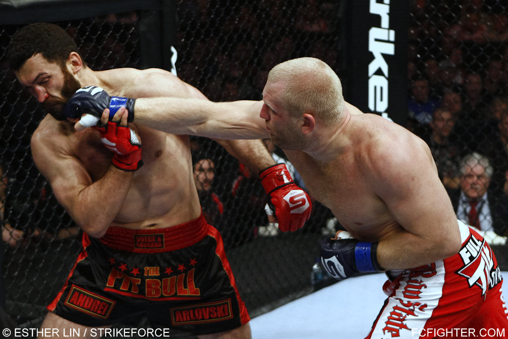 In the other heavyweight grand-prix, quarterfinal of the evening, Sergei Kharitonov eventually closed the distance on Andrei Arlovski and put the former UFC champ away with a series of strikes. Early on, Arlovski utilized leg kicks and footwork to avoid exchanging with the powerful striker, but Kharitonov pounced once his opponent was up against the cage fence. After being sent to the mat by a Kharitonov punch, several follow up strikes from above left Arlovski unconcious at 2:49 of the opening round.