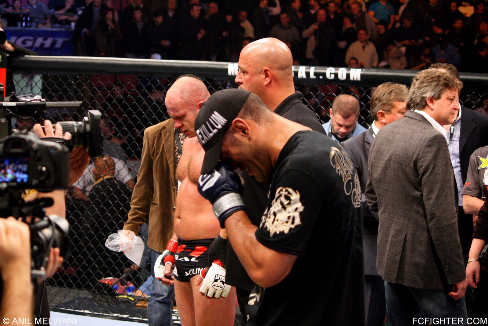 (February 12th, Meadowlands, N.J.) As the adage goes, “the bigger they come, the harder they fall”, and no where was that more true than in the opening installment of Strikeforce’s heavyweight tournament. Before a very sizeable crowd packed into the IZOD Center, legendary fighter Fedor Emelianenko – whose relatively small size belied his status as MMA behemoth – fell prey to the fists and jiu-jitsu of Antonio “Bigfoot” Silva, while former UFC champ Andrei Arlovski did his best to out-box Pride vet Sergei Kharitonov and wound up utterly starched on the canvas. They were big fighters, and boy did they fall hard. (Pictured: Fedor (left) and Silva reacting to the stoppage)