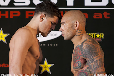 Here are the official weigh-in results for Strikeforce’s “Diaz vs. Cyborg” card tonight in San Jose, California. The card will feature two title fights, as welterweight champ Nick Diaz will take on Evangelista “Cyborg” Santos and middleweight champion Ronaldo “Jacare” Souza will face Robbie Lawler. (Pictured: Diaz (left) and Santos square off)