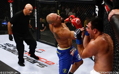 Freno’s Save Mart Center was again the host venue for Strikeforce’s latest Challenger card, which saw Bobby Voelker stop rising prospect Roger Bowling in the main event. The bout marked the second time the two had met; five months ago Voelker lost by technical decision when Bowling was unable to continue in the third round, after being accidentally poked in the eye. Last night’s win extended Voelker’s record to 23-8, while Bowling incurred a loss for the first time in his pro career, leaving his record at 8-1.(Pictured above-Voelker (left) and Bowling slugging it out)