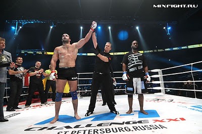 Below is video footage of M-1 Global Heavyweight Champion Guram Gugenishvili facing Maxim Grishin at M-1 Challenge XXIII on March 5th. The promotion announced this week that Gugenishvili will face American heavyweight Pat Bennett, at its upcoming July 8th event in the U.S. (Pictured: Gugenishvili after defeating Kenny Garner)